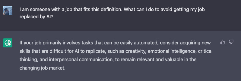 I asked GPT to help articulate this point. In the attached table, Job 1 would likely be replaced quickly. Job 2 is what you should aim to upskill towards if your current job is similar to Job 1.