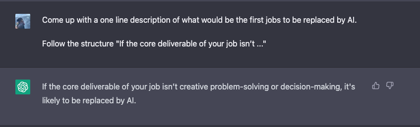 Now here’s where I start hypothesizing. If the core deliverable of your job isn’t creative problem-solving or decision-making, it's likely to be replaced by AI. These aren’t even my own words.